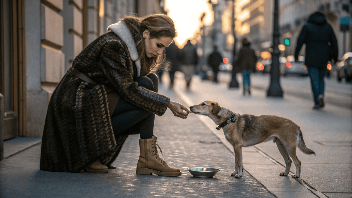 Ксения Вольская, в дорогущем плаще и замшевых сапогах, кормила худую бездомную собаку. Её накрашенные пальцы осторожно отрывали кусочки куриного мяса, а собака – грязная, хромая, с больными глазами – благодарно принимала угощение.