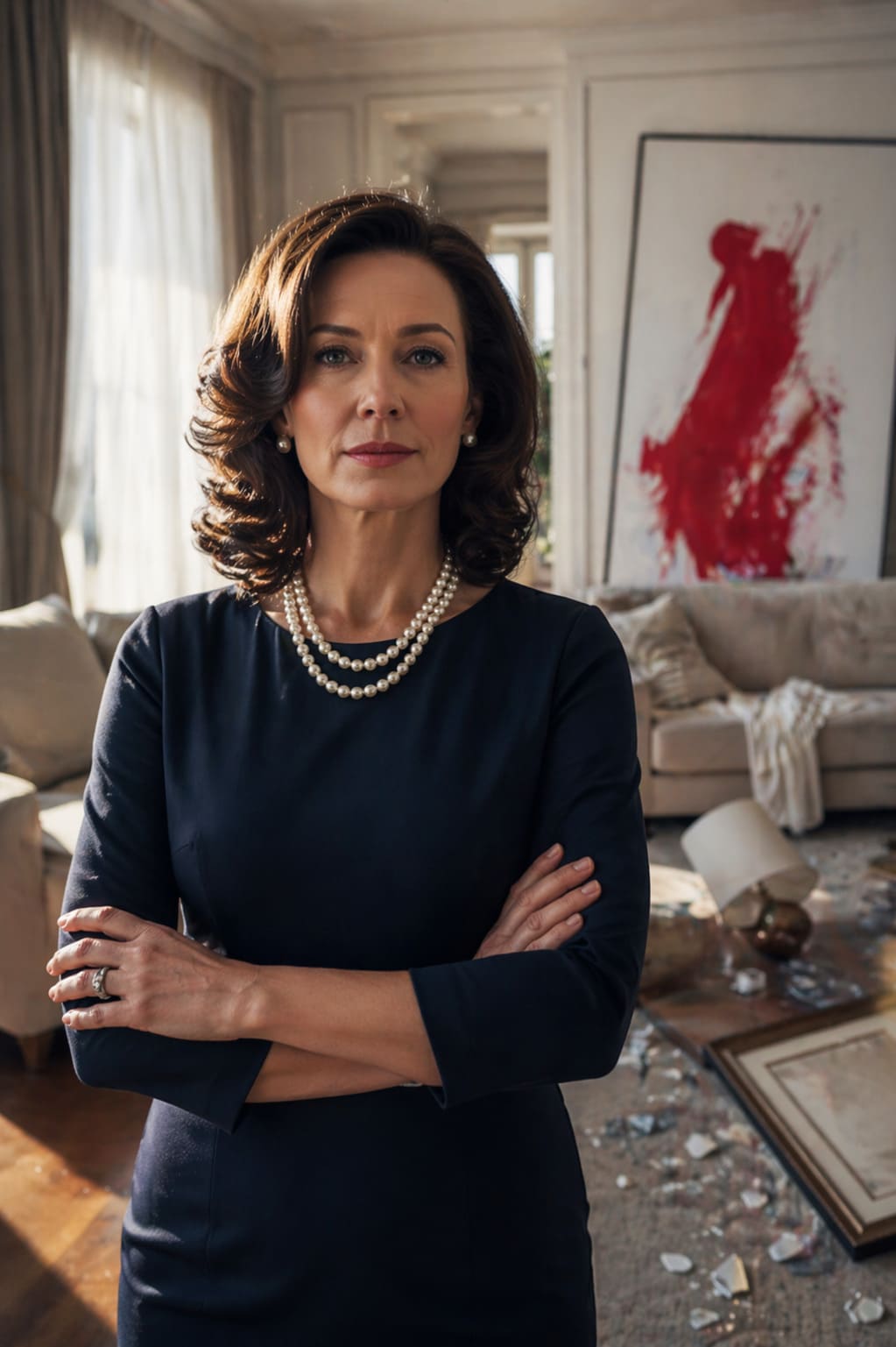 Она сняла жемчуг. Не аккуратно, не медленно, просто расстегнула замок и сняла, и положила на полку. Три нити. Девятнадцать лет оттенков бежевого. Пятнадцать лет кто-то решал за неё, какой цвет вульгарный, а какой создаёт ощущение пространства.