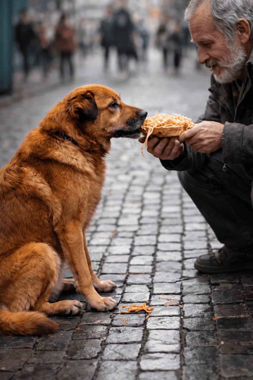 Еду он делил с одной большой, рыжей и худой собакой, которая очень боялась людей.