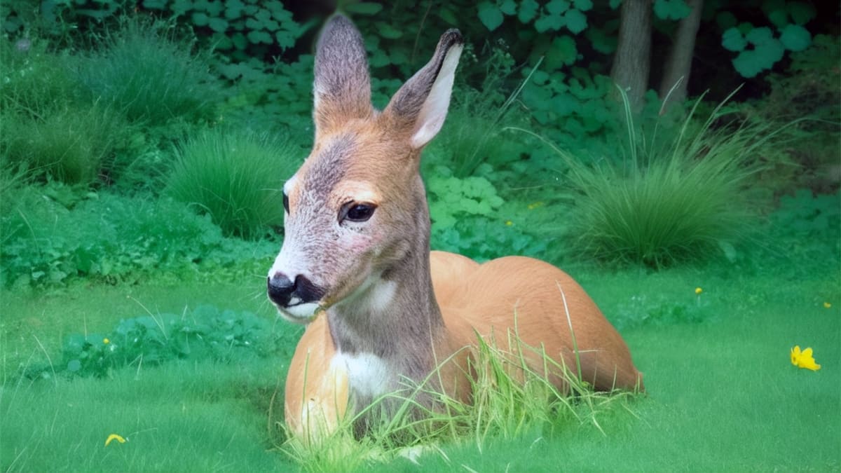 Косуля тревожно вздрогнула, повернула к нему голову. Закрыла собой ребёнка и грозно захрапела. Подняла правую переднюю ногу и сильно топнула ею.