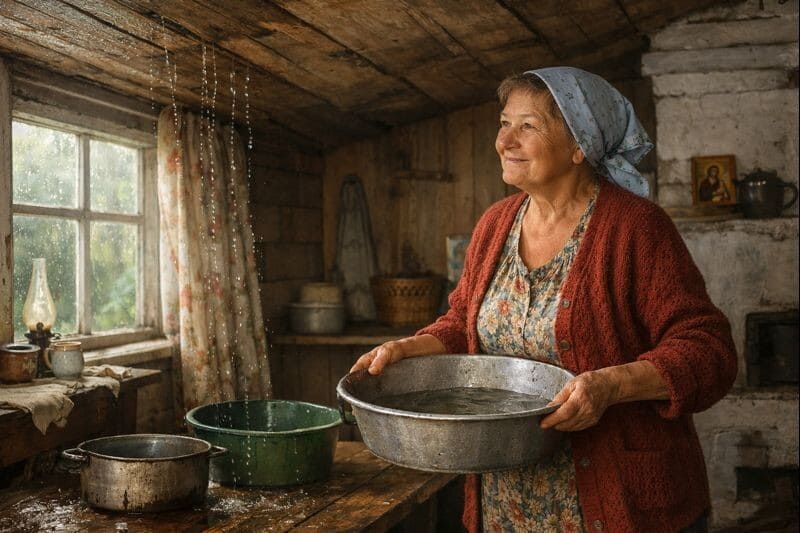 Васька привычно запрыгнул на печку и устроился за валенками, будто нашёл там самую надёжную крепость. Николай с удивлением наблюдал, как хозяйка расставляет тазы — уверенно, без прикидок. Было видно: она точно знает, где сейчас потечёт. Так и вышло.