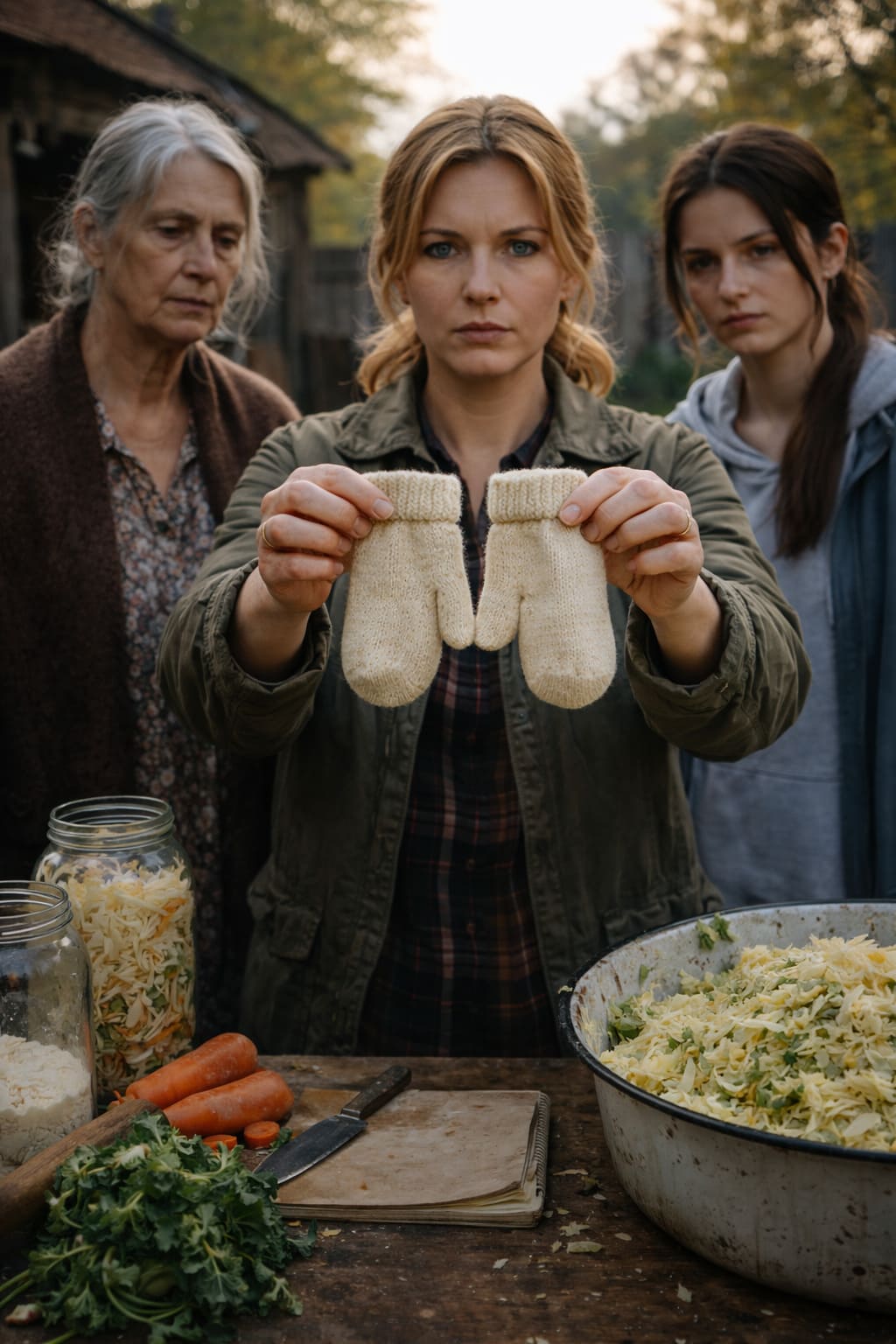 Она сняла с крючка его серую куртку, достала из кармана первую варежку и положила рядом со второй. Две маленькие шерстяные ладони легли на стол между банками, ножами и морковной стружкой. Обычный стол для капустницы вдруг стал похож на место, где больше нельзя делать вид.