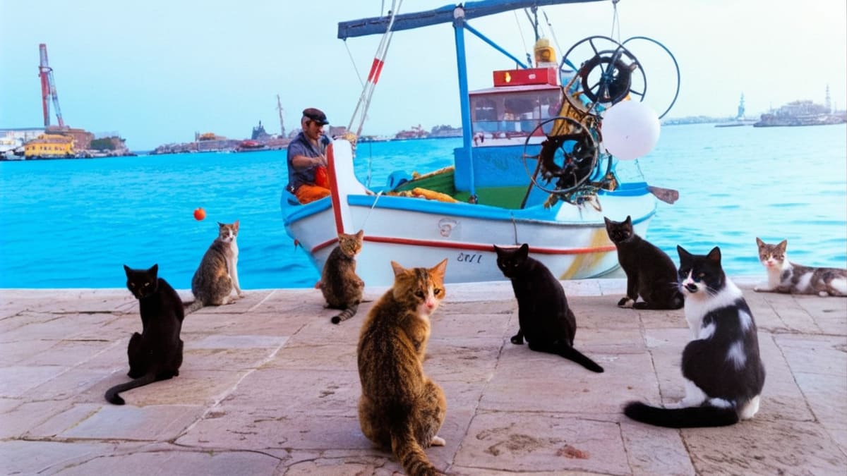 Теперь у рыбака было мало свободного времени, после того, как он раскладывал на пирсе свой улов. Он чистил котам рыбу и клал её на большой кусок целлофана, чтобы им удобнее было её брать и есть.