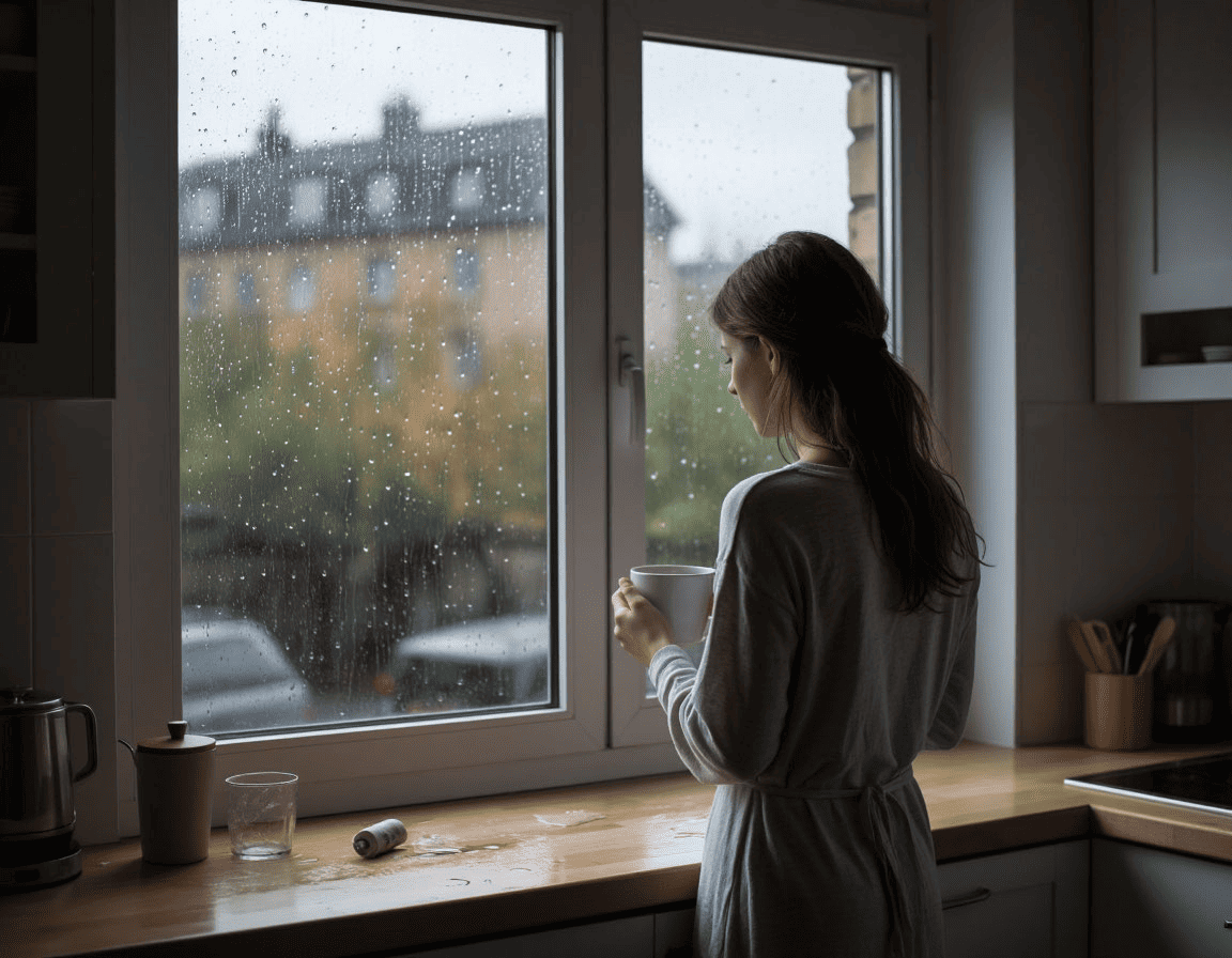 Даша стояла у окна на кухне, погружённая в свои мысли. За стеклом неторопливо стекали дождевые капли, рисуя на поверхности причудливые извилистые дорожки. Время от времени ветер усиливался, и тогда капли начинали двигаться быстрее, сливаясь в тонкие струйки, которые стремительно скользили вниз, словно торопясь куда‑то.