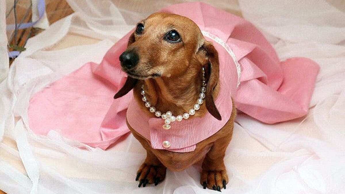 Через несколько минут он вошел, держа на поводке таксу в красном комбинезоне.