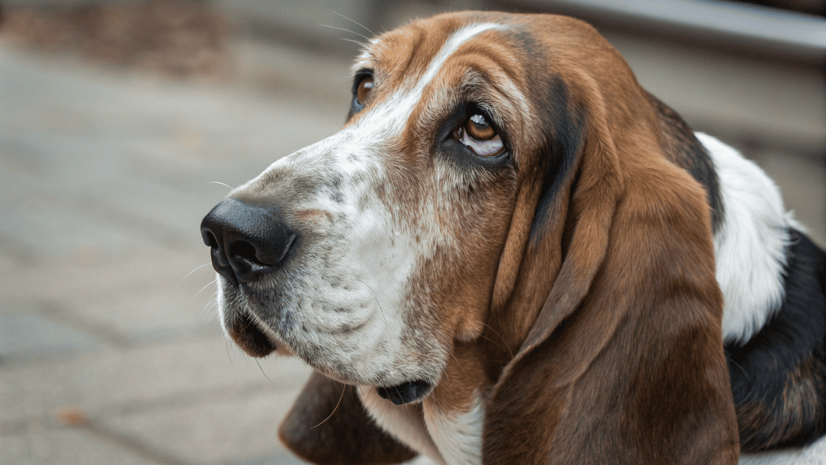 Пес. Пятнистый, с длинными ушами. Морда благородная, умная.
