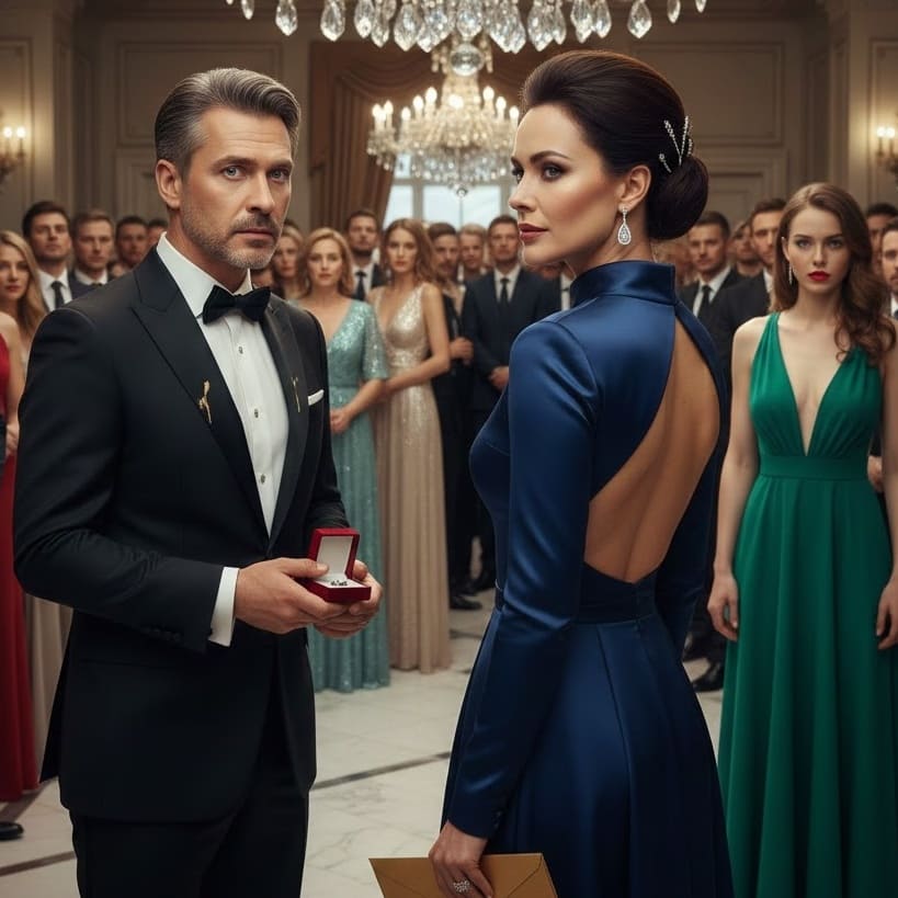 Она не вошла — она вплыла в зал, неся себя с таким достоинством, что официанты замерли с подносами в руках. Свет массивных люстр поймал переливы её темно-синего платья. Волосы были уложены в высокую, холодную прическу, открывающую длинную шею. На ней не было тяжелых ожерелий — только лаконичные серьги-капли, которые вспыхивали при каждом движении.