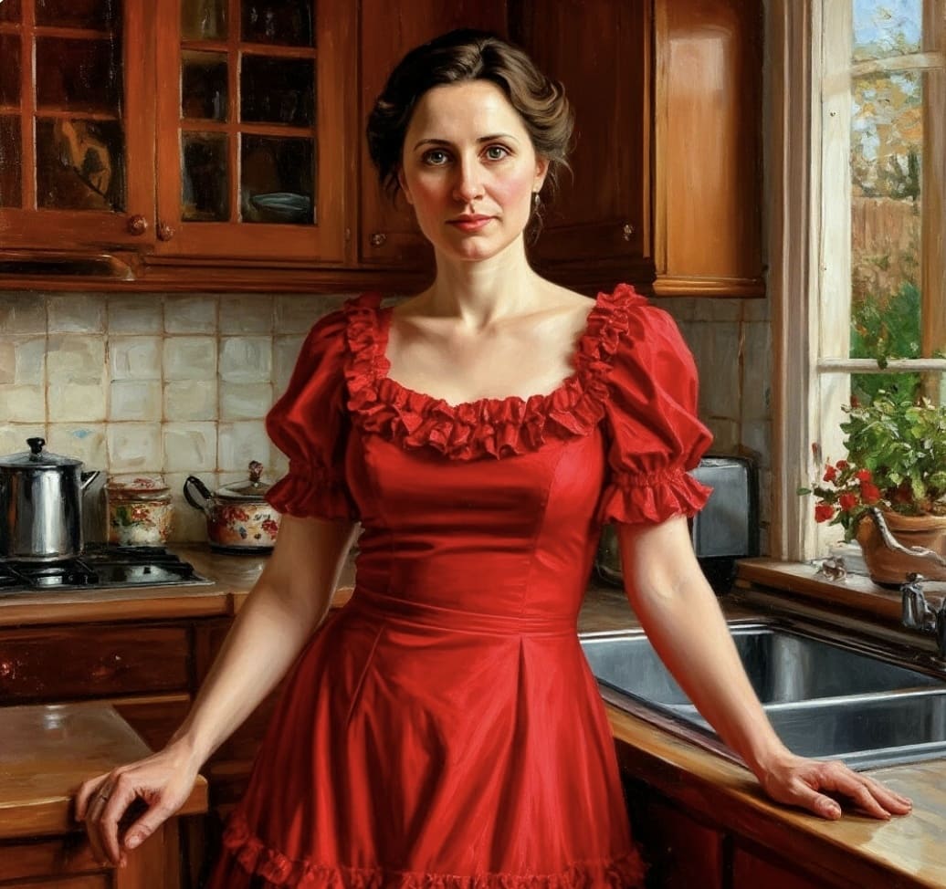 Так что же надеть? Наверное, вот это красное платье будет в тему. Нарядное, праздничное такое, с рюшами на рукавах. Чем не невеста? И туфли чёрные замшевые на каблуках облагородят образ. Ну хоть сейчас в Загс можно!