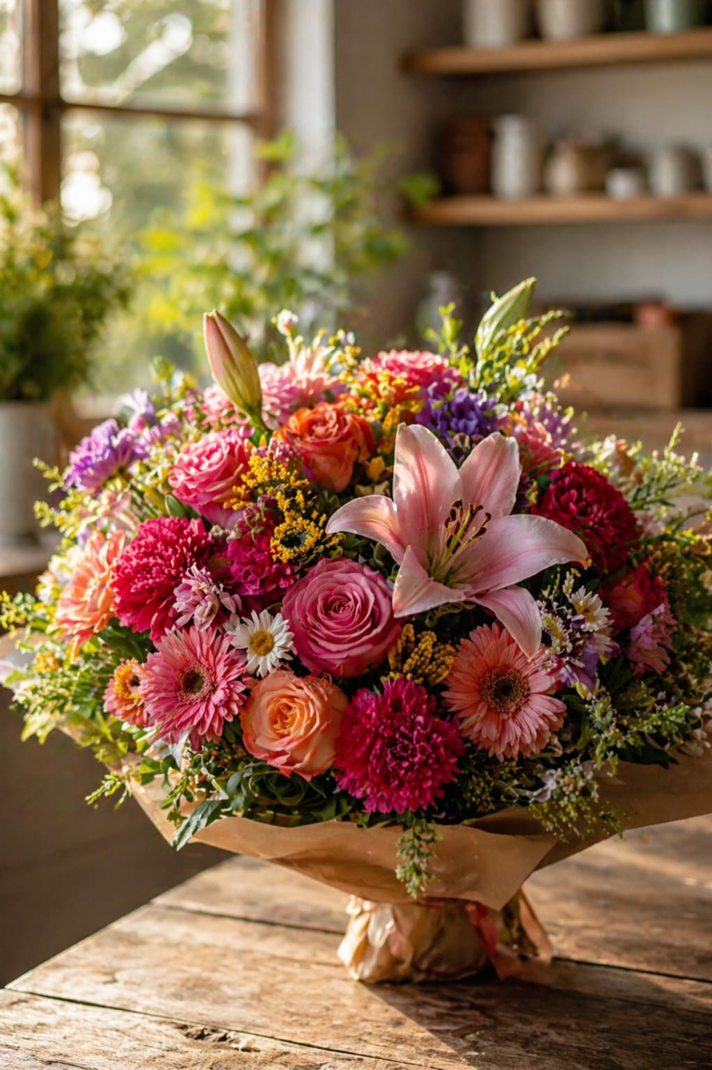 Однажды вечером она сидела в мастерской, уже после закрытия, и собирала букет для себя. Просто так: остатки зелени, три пиона, ветка облепихи. Никакого заказа, никакой цели. Просто потому что хотелось.