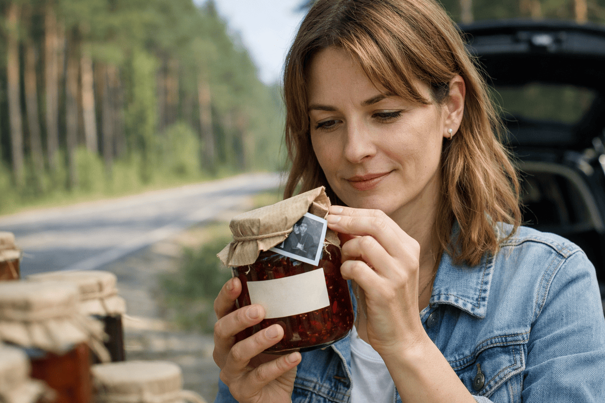 Вероника взяла банку, повернула её к свету и прочитала надпись, выведенную чёрными печатными буквами от руки: «Варенье с предсказанием». Ниже, красным, помельче было приписано: «Смородина». Крышку накрывали обёрточной бумагой, перевязанной суровой ниткой, словно это не обычная заготовка, а маленький подарок.