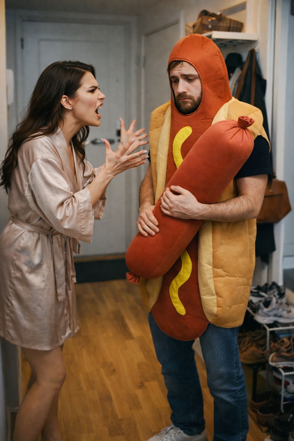 — Проблемы? — Марина нервно рассмеялась, и этот смех был похож на скрежет металла по стеклу. — Проблемы — это когда задерживают бонус. Проблемы — это когда мы не летим на Мальдивы, а едем в Турцию. А то, что ты стоишь передо мной в костюме еды — это не проблема. Это крах. Это позор. Это дно, Вадим! Ты — еда! Ты понимаешь это? Ты — гигантская, вонючая булка с сосиской!