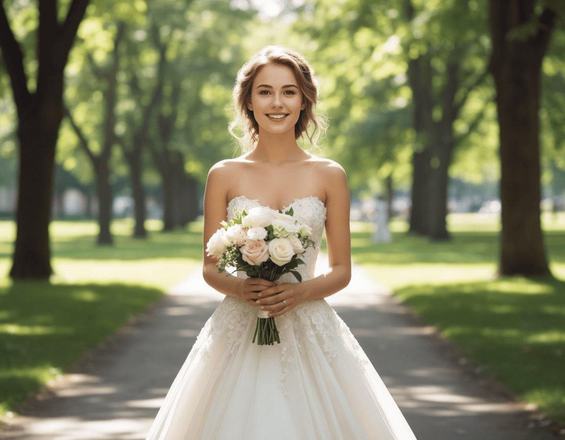 Алёна стояла перед большим зеркалом в прихожей и с восхищением разглядывала своё отражение. Она медленно повернулась, чтобы увидеть наряд со всех сторон, и платье заиграло новыми гранями: пышные складки переливались в лучах утреннего солнца, а крошечные стразы, будто россыпь звёзд, вспыхивали при каждом движении. Кружева на лифе и рукавах придавали образу нежность и утончённость – в этом платье Алёна чувствовала себя настоящей принцессой. Ей даже показалось, что она вот‑вот услышит музыку из сказки и увидит вокруг танцующих фей. Только короны не хватало.