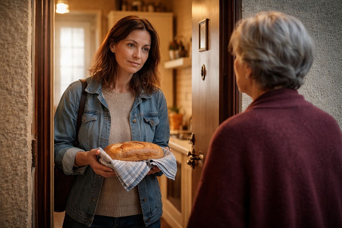 Через неделю Алина встала раньше всех. На кухне было ещё серо. За окном дворник вёл метлу по асфальту, и этот звук шёл снизу, ровный и деловой. Она нарезала хлеб не тонко, не на свет, а как режут для семьи, которая собирается завтракать вместе. Потом завернула целую тёплую буханку в чистое полотенце и вышла на площадку.
